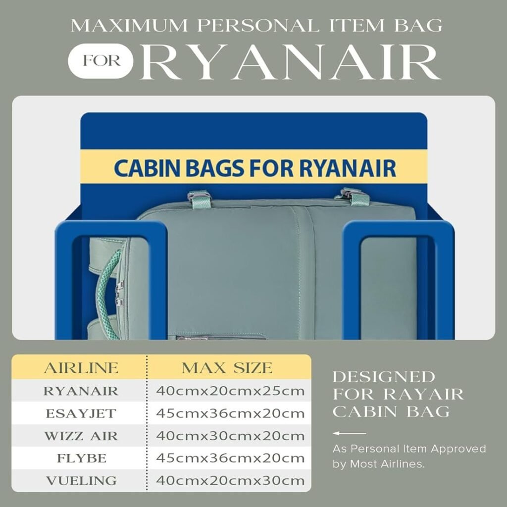 1. Compatibilidad Aerolíneas: Mochila de 40x20x25 cm, 20L, apta para Ryanair y otras aerolíneas europeas como Vueling o Lufthansa.